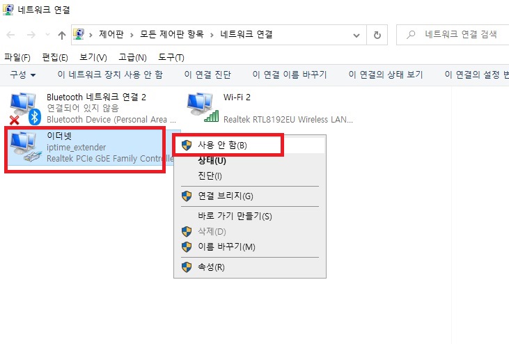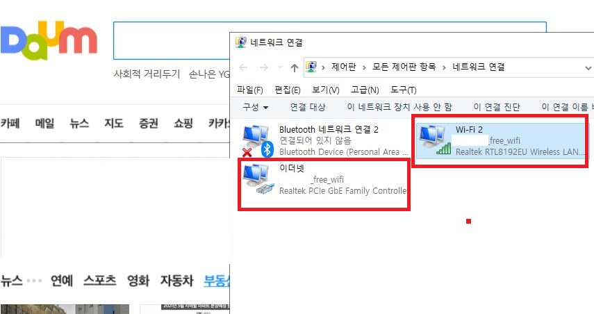 테스트를 컴퓨터에서 무선랜카드를 이용하여 진행했더니 랜 선과 와이파이가 둘 다 연결되어 있습니다.