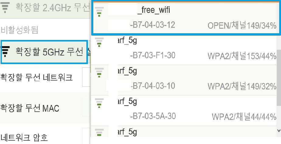 그 다음, 좌측 메뉴 하단 - 고급 설정- 5GHZ 무선랜 설정- 익스텐더 설정을 차례로 선택한 후 우측 창 상단에서 AP 검색 버튼을 눌러 줍니다. (제품을 테스트하는 장소에 공용와이파이 신호만 있어서 부득이 네트워크 이름 일부를 지웠습니다.)