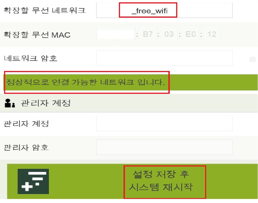 이 두 가지 설정만 하고 저장 버튼을 클릭하면 설정 값이 저장되며 와이파이 확장모드를 사용할 수 있으며 증폭기와 연결된 컴퓨터는 랜 선이 연결된 상태에서 곧바로 인터넷 연결이 가능합니다.