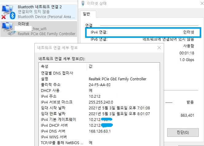 와이파이 증폭기와 랜 선으로 연결된 컴퓨터의 IP 정보를 보면 공용와이파이 IP가 셋팅된 것을 확인할 수 있습니다.