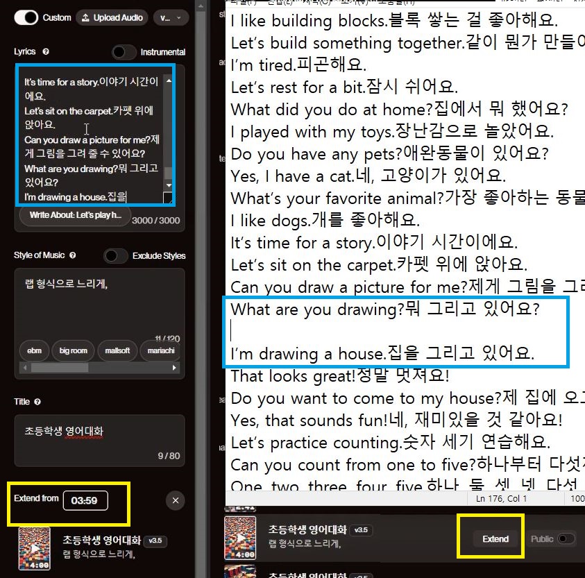 처음 곡목록 우측에 있는 Extend 메뉴를 선택한 후 곧바로 제한에 걸린 나머지 가사를 전부 가사 입력란에 붙여넣습니다. 만약 이번에도 가사가 길어 제한에 걸린 부분이 있다면 지금 하고 있는 작업을 한 번 더 반복해서 실행하면 곡 길이를 더 늘릴 수 있습니다.