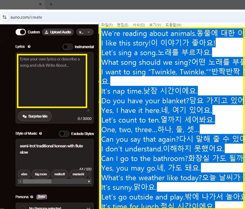 먼저 SUNO AI를 커스텀 모드로 선택한 후 가사 입력란에 전체 가사를 붙여넣기 합니다.